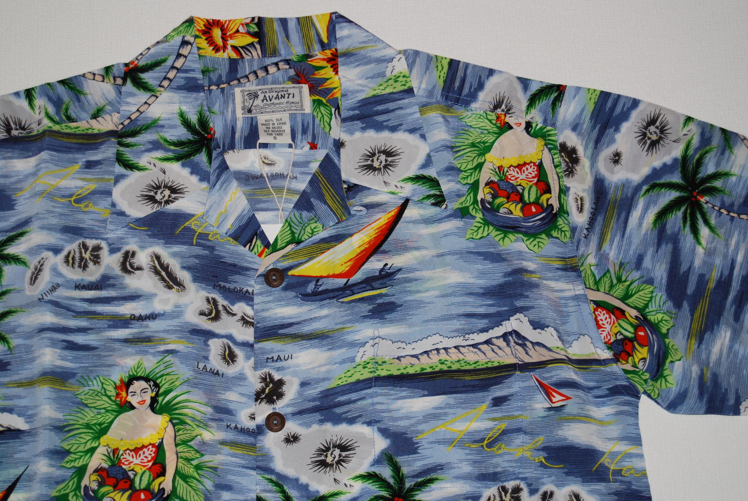 アロハシャツ/メンズ/半袖/大きいサイズ/ブランド/AVANTI SILK(アヴァンティ シルク)/A1216BLU/青(あお)/ハワイ諸島/海/SEA/フラガール/ヤシの木/果物/おしゃれ/人気/プレゼント/ヴィンテージレプリカ/ギフト/シルク100%/開襟(オープンカラー)/送料無料