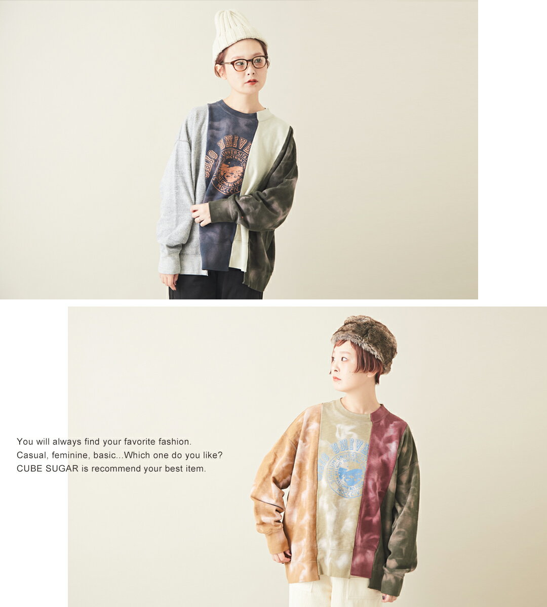 異なるトレーナーをつないだようなツギハギのデザインが特徴的なスウェットトップスが登場。
