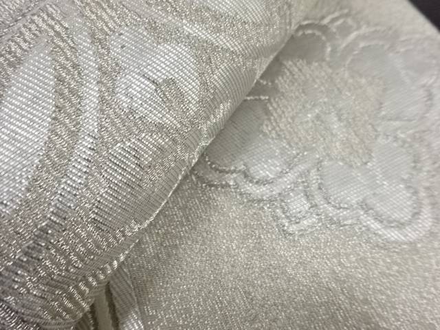 <帯サイズ>長さ412幅30 状態:非常によい素材:正絹色目:銀帯幅部分折れ山線に薄くすみと無地部分、帯裏に薄点アクが多少有ります。
